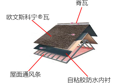 欧文斯科宁屋面瓦是由四种成分组成,即:沥青、填充料、加强毡和表面矿粒。每种成分都对屋面瓦系统的性能起着作用。下列示意图说明欧文斯科宁玻璃纤维沥青屋面瓦构造。矿粒嵌入一层由沥青和填充料的混合物组成的填充料覆盖层。湿法生产的玻璃纤维毡加强该填充料覆盖层。一层填充料覆盖层也置于瓦背面,用一层砂覆盖,可防止屋面瓦粘在一起。