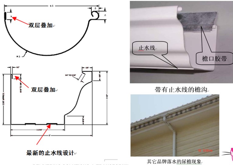 1)、挂钩双钉固定,强度牢固,承载重。弧形的曲面檐沟不仅外形美观,又可以增加强度,防止弯曲变形,并可满足抗风载和冰、雪载荷。