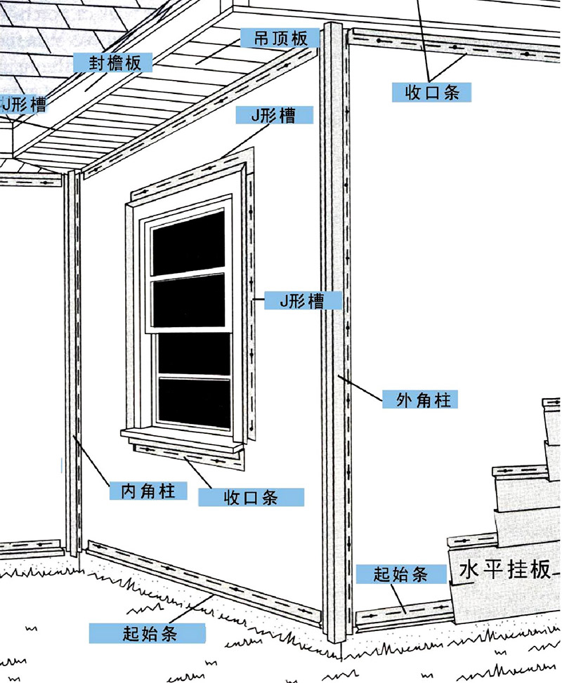 常位于屋檐下、女儿墙顶、窗洞口及其它洞口下方,用于固定最后一片挂板.当窗洞口较长,而窗洞口上方的第一片挂板需切割,无法安装起始条时,用收口条固定挂板。